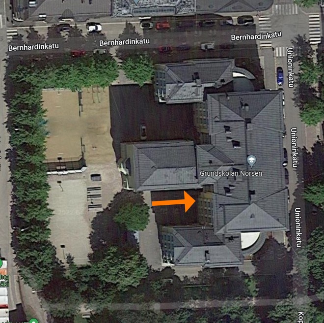 Ingång till skolköket från gårdssidan; orange pil. Parkering är tillåten för Gillekockar på skolans gård.